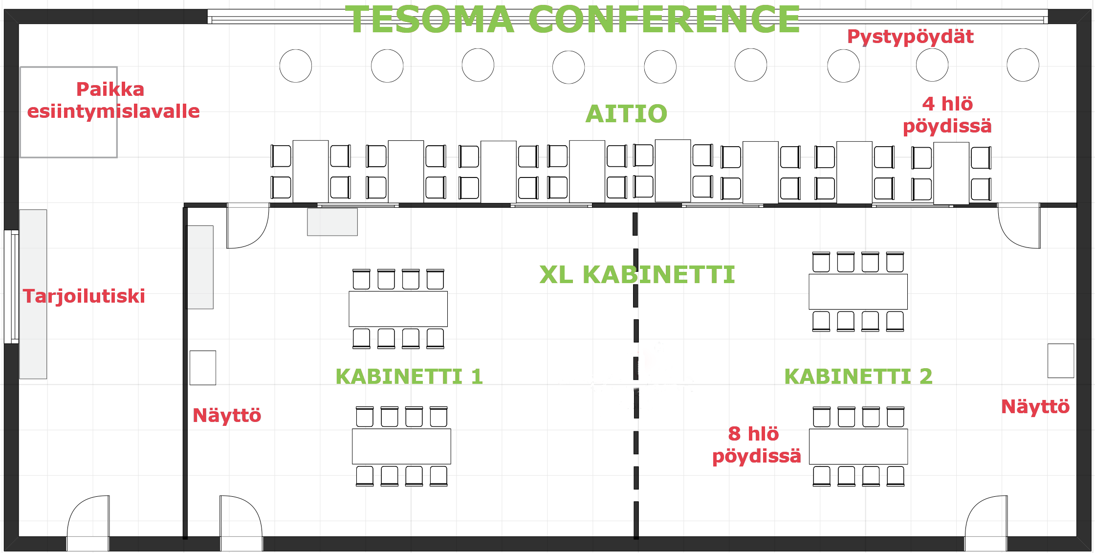 Tesoma Conference ✦ 80 henkilöä + 9 pystypöytää ✦ 150 eur / tunti